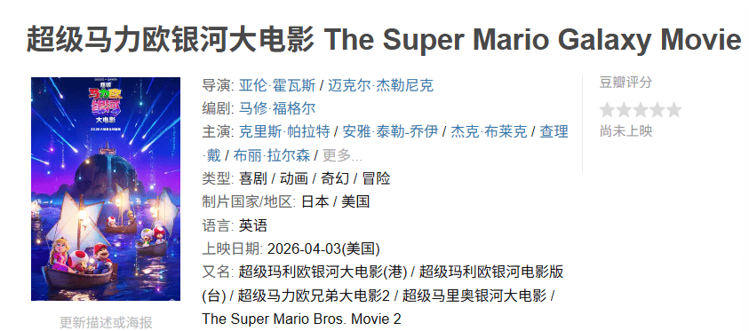 看点:几代玩家都曾漫游过蘑菇王国,这种亲切感曾助力《超级马力欧兄弟大电影》狂揽十亿美金。续作应能延续辉煌,尤其是它几乎独占了春季档的票房蓝海。
