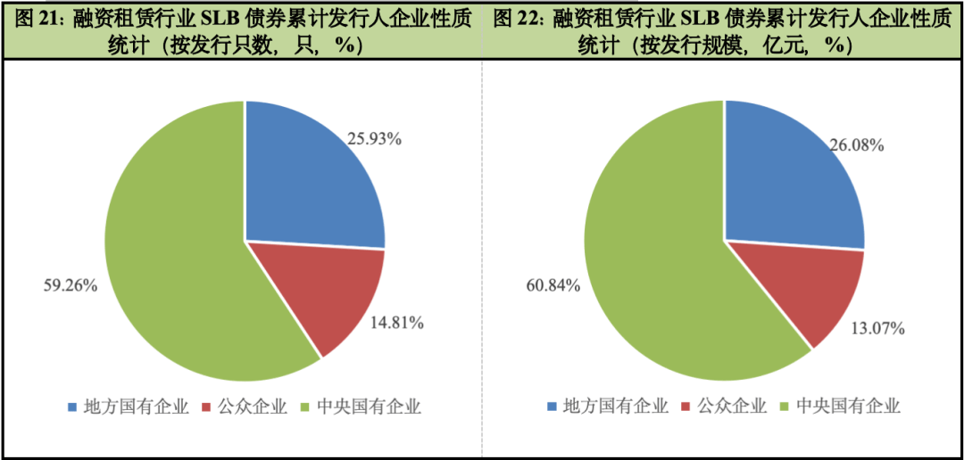从发行人性质来看,2021~2025年,融资租赁行业累计发行的SLB债券主要以中央国有企业为主,且无论是发行只数还是发行规模均呈波动增长趋势。截至2025年末,融资租赁行业中央国有企业的SLB发行只数和发行规模分别占该行业SLB总发行只数和发行规模的59.26%和60.84%;地方国有企业发行的SLB只数和规模分别占该行业SLB总发行只数和发行规模的比例为25.93%和26.08%。