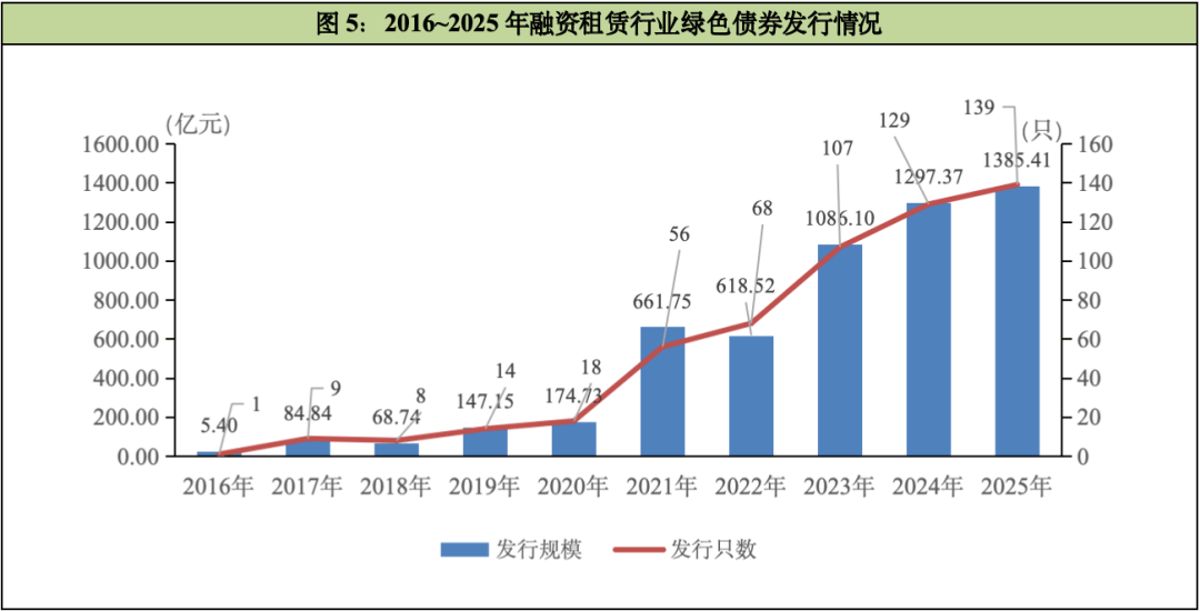 2025年融资租赁行业绿色债券的发行量及发行规模均达到历年最高,共计139只(含1只“绿色债券+可持续挂钩债券”双贴标)、1,385.41亿元。与2024年度相比,融资租赁行业2025年绿色债券的发行只数和发行规模分别同比增长7.75%和6.79%。