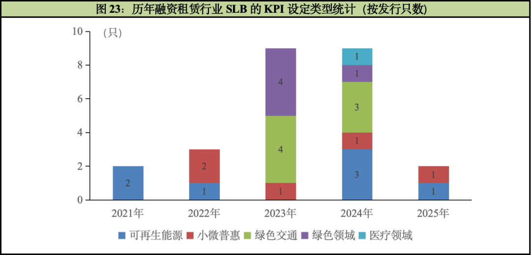 在历年SLB债券KPI类型来看,2021~2024年融资租赁行业发行SLB债券常用的关键绩效指标KPI类型为可再生能源、小微普惠、绿色交通、绿色领域和医疗领域,2025年发行的SLB仅两只获取到KPI设置信息,分别为可再生能源和小微普惠领域。总体而言,融资租赁行业SLB债券的KPI设定呈现出多维度多领域的变化趋势。