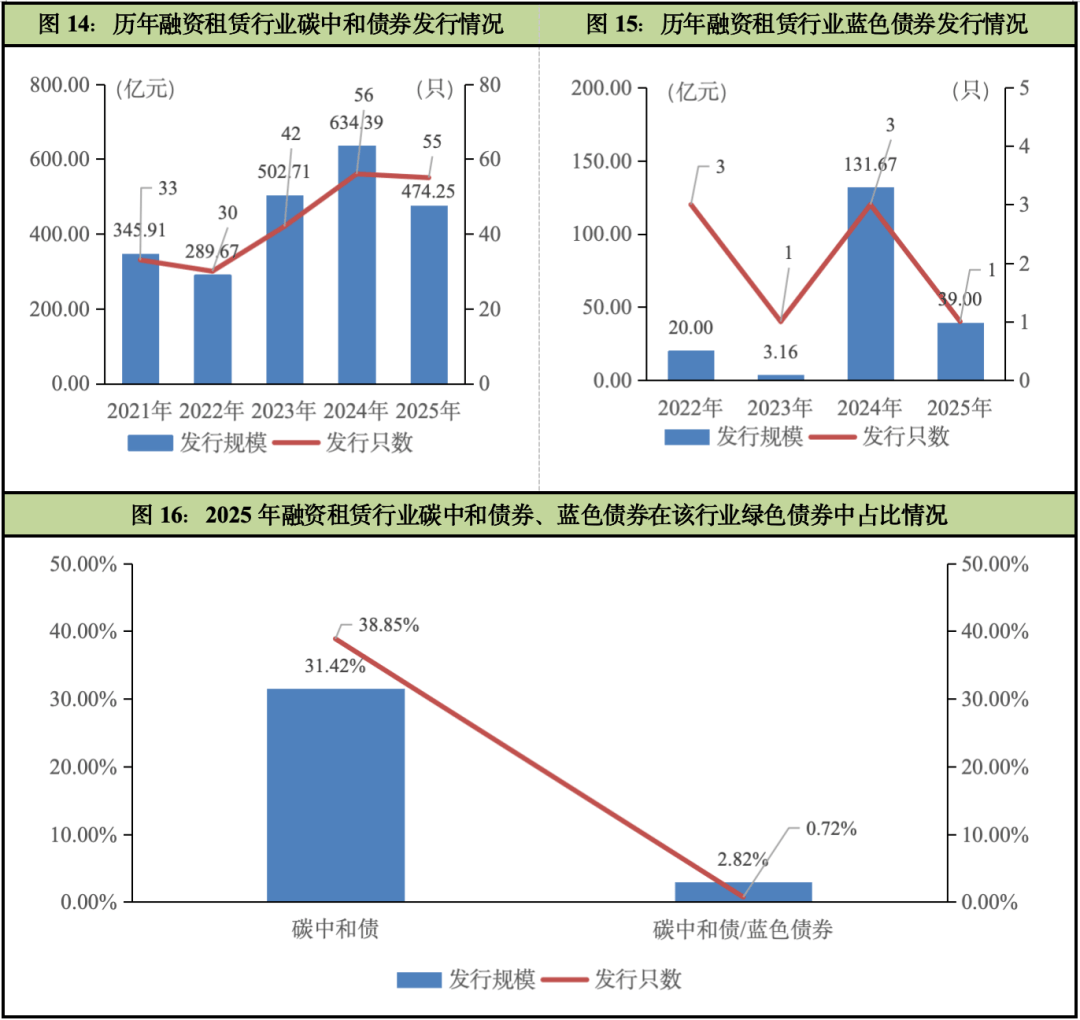 2025年,融资租赁行业共发行1只蓝色债券(含1只“蓝色债券+碳中和债券”双贴标债券),发行规模共计39.00亿元,较2024年下降,可能与蓝色债券募集资金须专项用于海洋保护、可持续渔业、滨海生态修复等特定领域,此类项目往往投资规模大、周期长、技术复杂,融资租赁业务模式以设备融资租赁为主,其资产通常更侧重于分布式、标准化设备,与蓝色经济所需的大型海洋基础设施或生态修复项目的契合度相对有限有关。