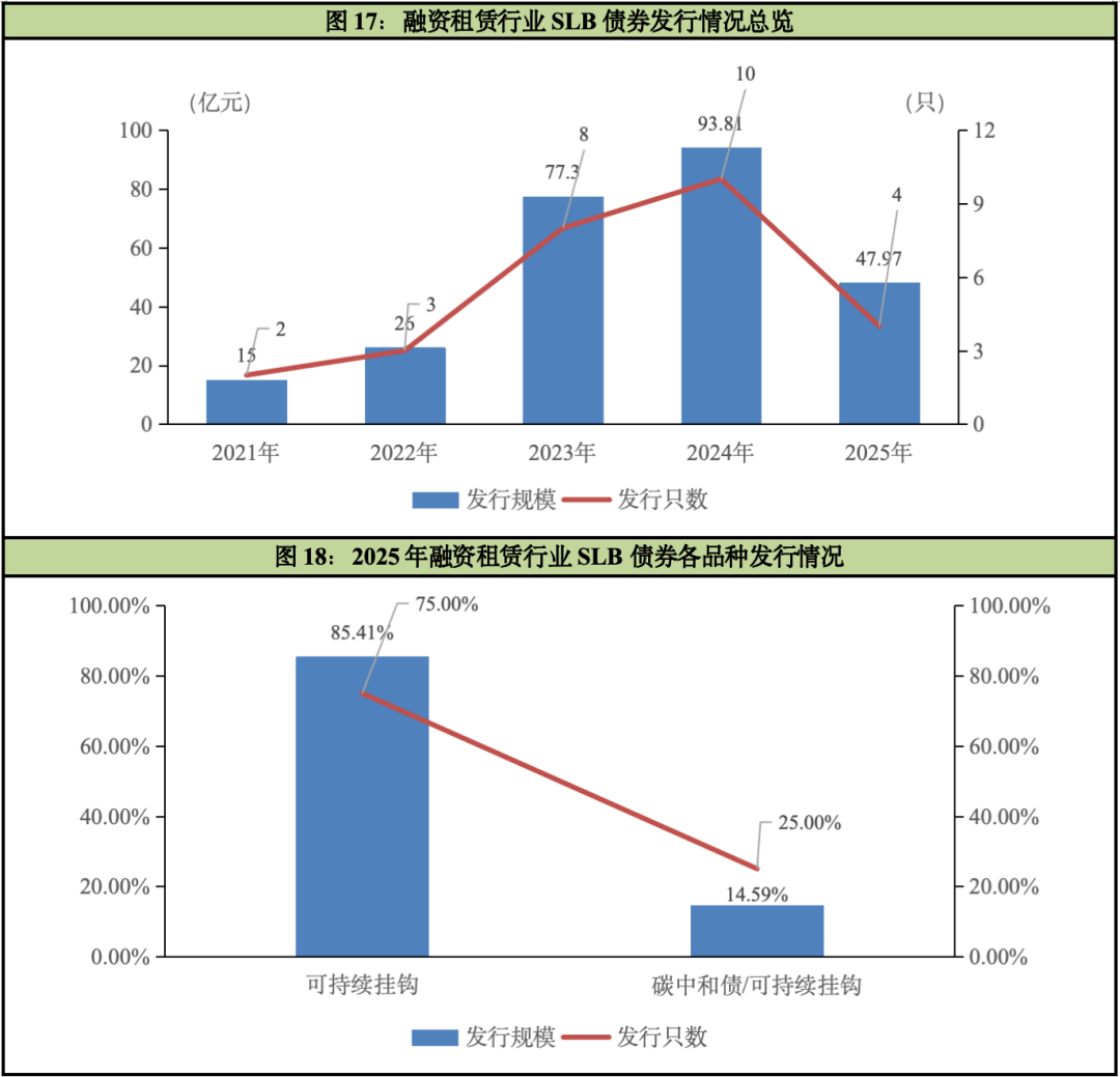 融资租赁行业自发行可持续挂钩债券(以下简称“SLB”)以来,在2021年~2024年发行只数和发行规模均呈逐年上升趋势,2025年则出现“大跳水”现象。截至2025年末,融资租赁行业共发行27只SLB(含6只“绿色债券+SLB”双贴标),累计发行规模达260.08亿元。其中,2025年度共发行4只(含1只“碳中和债券+SLB”双贴标),发行规模为47.97亿元,发行只数和规模相较2024年同比分别下降了60.00%和48.86%。