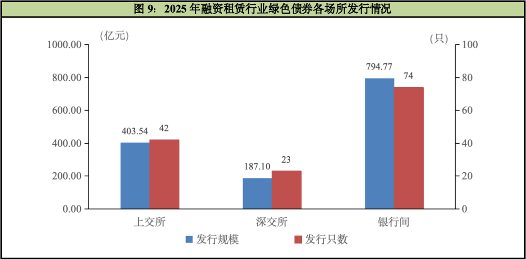 2025年,融资租赁行业在银行间市场、深交所的发行只数和发行规模,均较2024年有明显增长,但在上交所的发行只数和发行规模较2024年有明显下降。2025年,融资租赁行业在银行间市场共发行绿色债券74只,占同年该行业绿色债券总只数的53.24%,为本年度发行数量最大的发行场所;在银行间市场发行的绿色债券规模达794.77亿元,占同年该行业绿色债券总规模的57.37%,为本年度发行规模最大的发行场所。