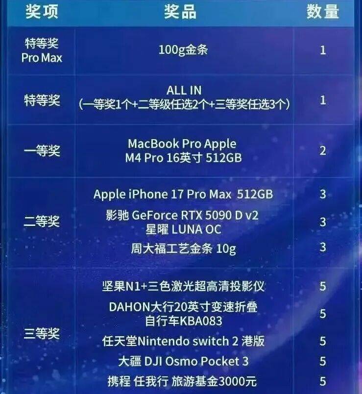 有“广州米哈游”之称的库洛游戏今年奖品也有所升级,头等奖“金色传说”是一台价值超过1.5万的iMac,第二大奖项包括10克的周大福金条、iPhone 17 Pro等,价格超过1万元。