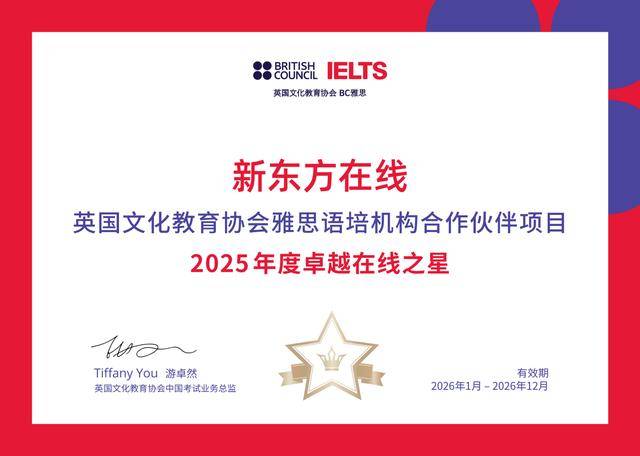 金年会,金年会官网,金年会平台,金年会登录,金年会网址,金年会网站,金年会app,金年会官方网站,金年会体育,金年会数字站,金年会娱乐,金年会体育赛事,金年会体育,金年会最新入口2026年2月12日,雅思考试主办方英国文化教育协会(British Council)宣布“2025年度雅思官方合作伙伴评级”结果。凭借在雅思教育领域的突出表现,新东方在线蝉联英国文化教育协会雅思语培机构合作伙伴项目“白金级合作伙伴”称号,并斩获“2025年度卓越在线之星”奖项。